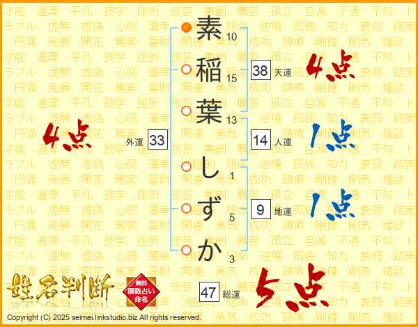 素(10画)稲(15画)葉(13画) し(1画)ず(5画)か(3画)