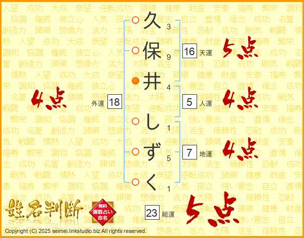 久(3画)保(9画)井(4画) し(1画)ず(5画)く(1画)