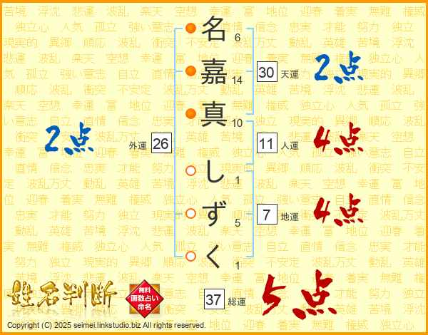 名(6画)嘉(14画)真(10画) し(1画)ず(5画)く(1画)