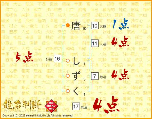 生活面を象徴する運勢です。外部から受ける影響力を表し、結婚運、家庭運や職場、環境への順応性を表します。総運から人運を引いた画数。姓や名が1文字の場合を除く。