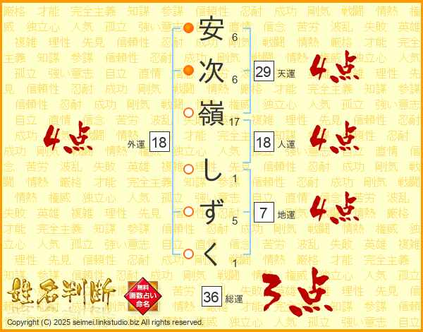 安(6画)次(6画)嶺(17画) し(1画)ず(5画)く(1画)