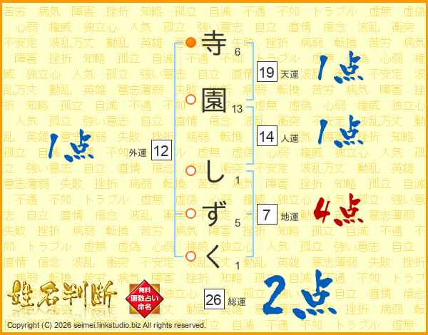 生活面を象徴する運勢です。外部から受ける影響力を表し、結婚運、家庭運や職場、環境への順応性を表します。総運から人運を引いた画数。姓や名が1文字の場合を除く。