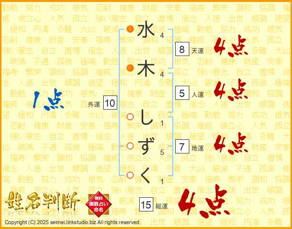 水(4画)木(4画) し(1画)ず(5画)く(1画)