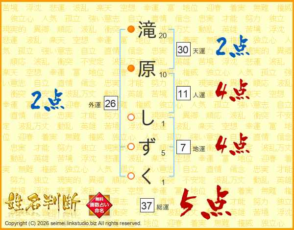 あなたの人生を表す1番重要な運勢です。生涯を通じて影響する総合運となり、主に50歳以降の晩年期に影響を及ぼします。苗字と名前の合計画数。