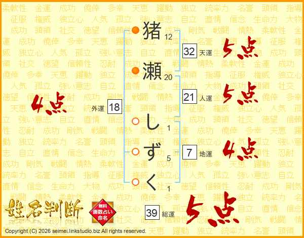 猪瀬しずくさんの総運は39画の5点!