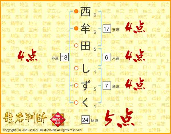 西(6画)牟(6画)田(5画) し(1画)ず(5画)く(1画)