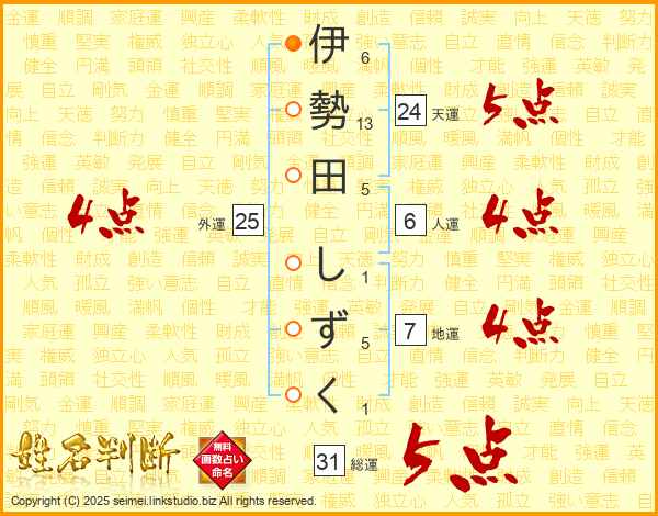 伊(6画)勢(13画)田(5画)  し(1画)ず(5画)く(1画)