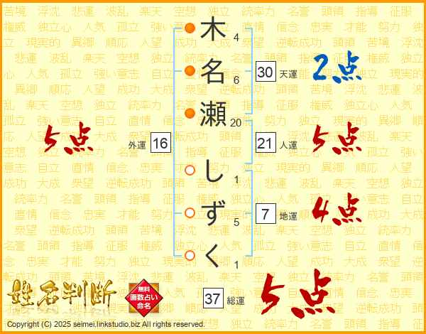 木(4画)名(6画)瀬(20画) し(1画)ず(5画)く(1画)