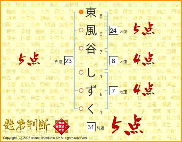 東(8画)風(9画)谷(7画) し(1画)ず(5画)く(1画)