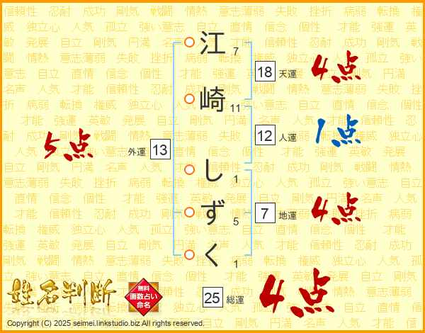 江(7画)崎(11画) し(1画)ず(5画)く(1画)