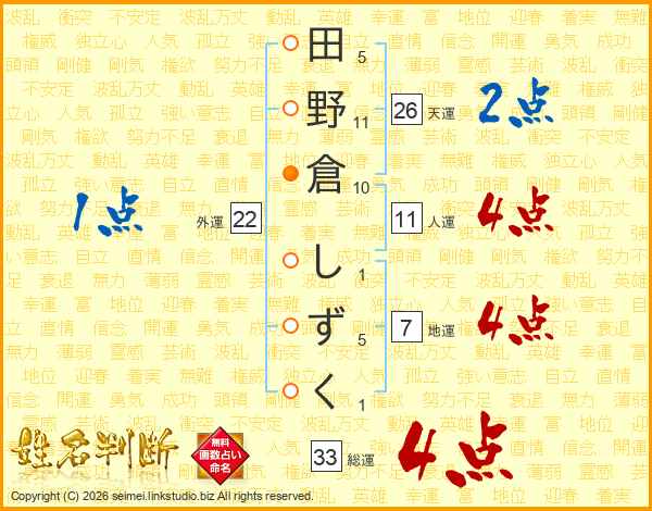 生活面を象徴する運勢です。外部から受ける影響力を表し、結婚運、家庭運や職場、環境への順応性を表します。総運から人運を引いた画数。姓や名が1文字の場合を除く。