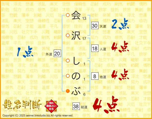 会(13画)沢(17画) し(1画)の(1画)ぶ(6画)