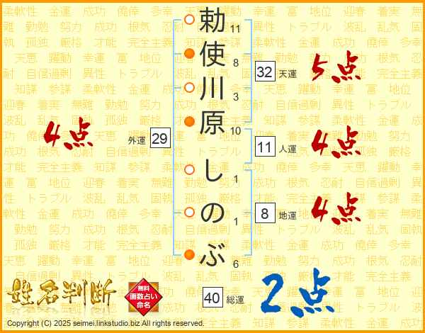 生活面を象徴する運勢です。外部から受ける影響力を表し、結婚運、家庭運や職場、環境への順応性を表します。総運から人運を引いた画数。姓や名が1文字の場合を除く。