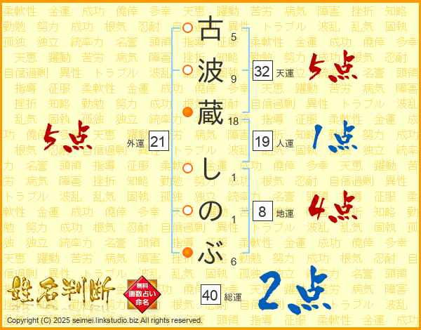 古(5画)波(9画)蔵(18画) し(1画)の(1画)ぶ(6画)