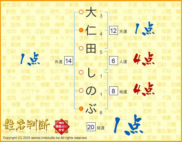 大(3画)仁(4画)田(5画) し(1画)の(1画)ぶ(6画)
