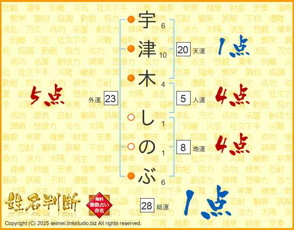 宇(6画)津(10画)木(4画) し(1画)の(1画)ぶ(6画)