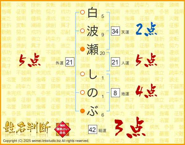 あなたの人生を表す1番重要な運勢です。生涯を通じて影響する総合運となり、主に50歳以降の晩年期に影響を及ぼします。苗字と名前の合計画数。