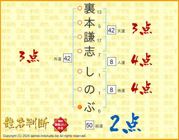 裏(13画)本(5画)謙(17画)志(7画) し(1画)の(1画)ぶ(6画)