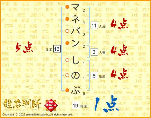 マ(2画)ネ(4画)パ(3画)ン(2画) し(1画)の(1画)ぶ(6画)
