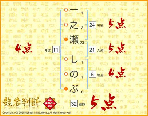 一(1画)之(3画)瀬(20画) し(1画)の(1画)ぶ(6画)