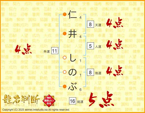 仁(4画)井(4画) し(1画)の(1画)ぶ(6画)