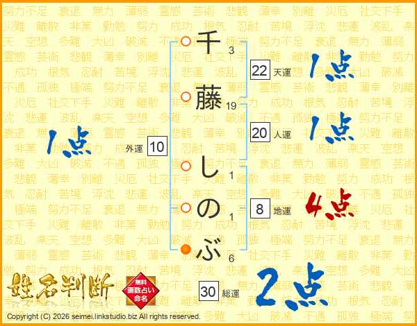 生活面を象徴する運勢です。外部から受ける影響力を表し、結婚運、家庭運や職場、環境への順応性を表します。総運から人運を引いた画数。姓や名が1文字の場合を除く。