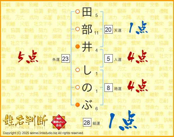 生活面を象徴する運勢です。外部から受ける影響力を表し、結婚運、家庭運や職場、環境への順応性を表します。総運から人運を引いた画数。姓や名が1文字の場合を除く。