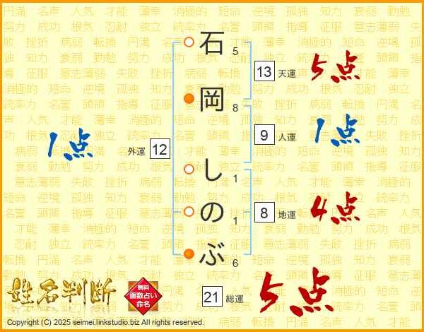 石(5画)岡(8画) し(1画)の(1画)ぶ(6画)