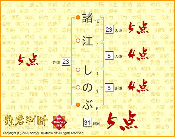 諸(16画)江(7画) し(1画)の(1画)ぶ(6画)