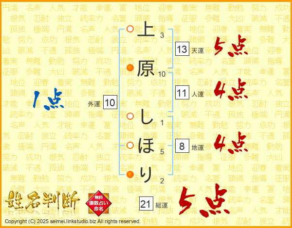 生活面を象徴する運勢です。外部から受ける影響力を表し、結婚運、家庭運や職場、環境への順応性を表します。総運から人運を引いた画数。姓や名が1文字の場合を除く。