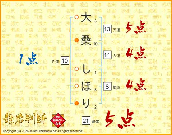 大(3画)桑(10画) し(1画)ほ(5画)り(2画)
