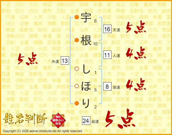 宇(6画)根(10画) し(1画)ほ(5画)り(2画)