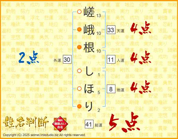嵯(13画)峨(10画)根(10画) し(1画)ほ(5画)り(2画)