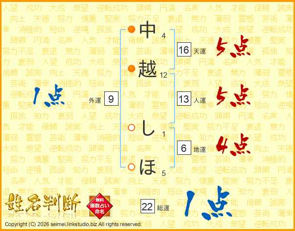 中越しほさんの天運は16画の5点!