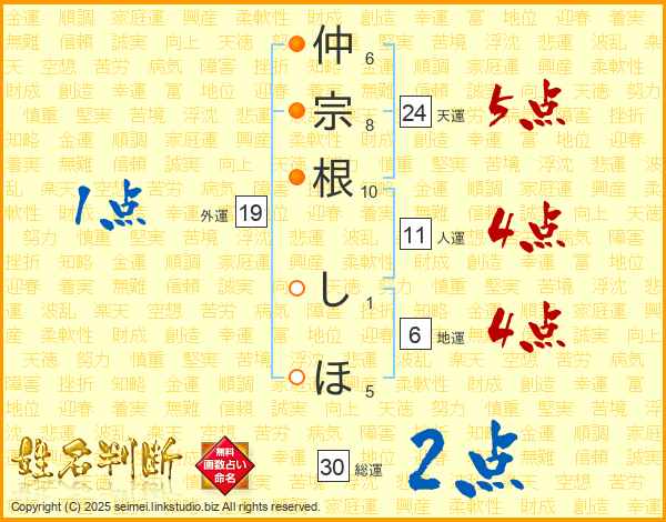 仲(6画)宗(8画)根(10画) し(1画)ほ(5画)