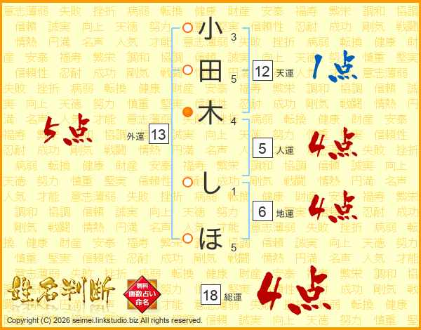 小(3画)田(5画)木(4画) し(1画)ほ(5画)