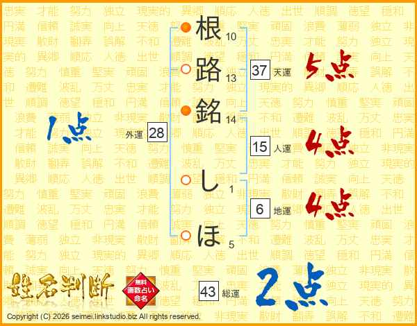 根(10画)路(13画)銘(14画) し(1画)ほ(5画)