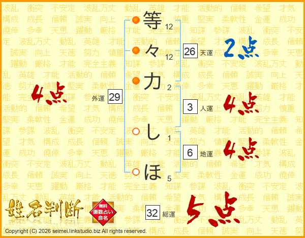 生活面を象徴する運勢です。外部から受ける影響力を表し、結婚運、家庭運や職場、環境への順応性を表します。総運から人運を引いた画数。姓や名が1文字の場合を除く。