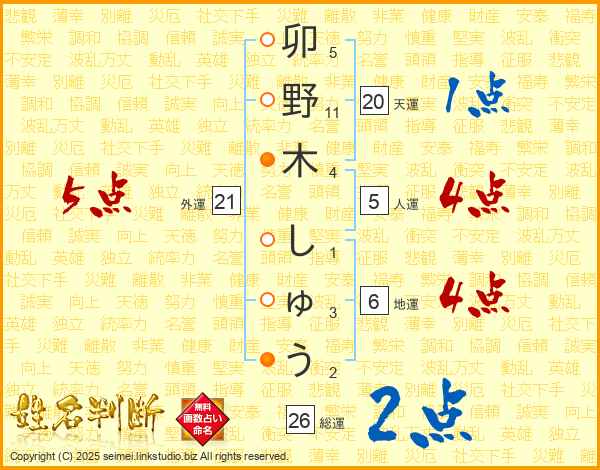 卯(5画)野(11画)木(4画) し(1画)ゅ(3画)う(2画)