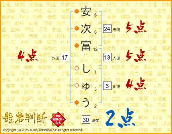 安(6画)次(6画)富(12画) し(1画)ゅ(3画)う(2画)