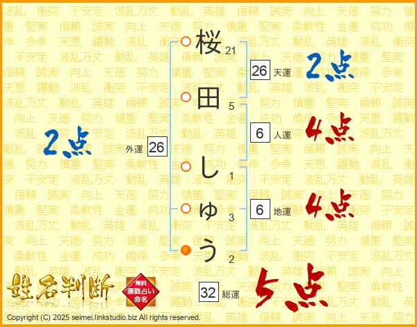 桜(21画)田(5画) し(1画)ゅ(3画)う(2画)