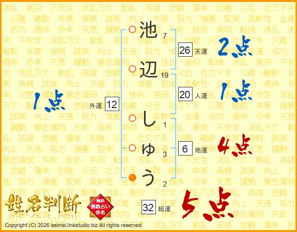 池(7画)辺(19画) し(1画)ゅ(3画)う(2画)