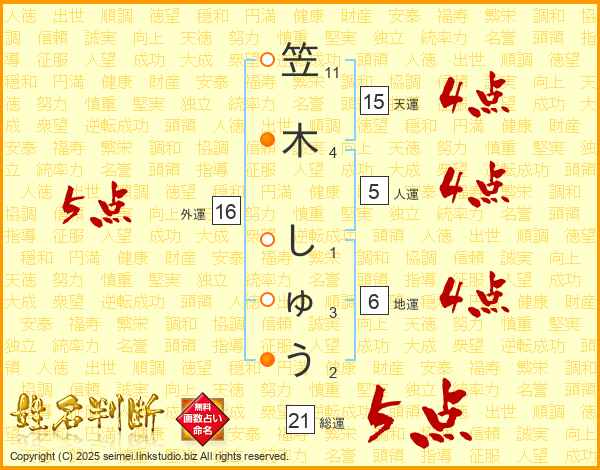 笠(11画)木(4画) し(1画)ゅ(3画)う(2画)