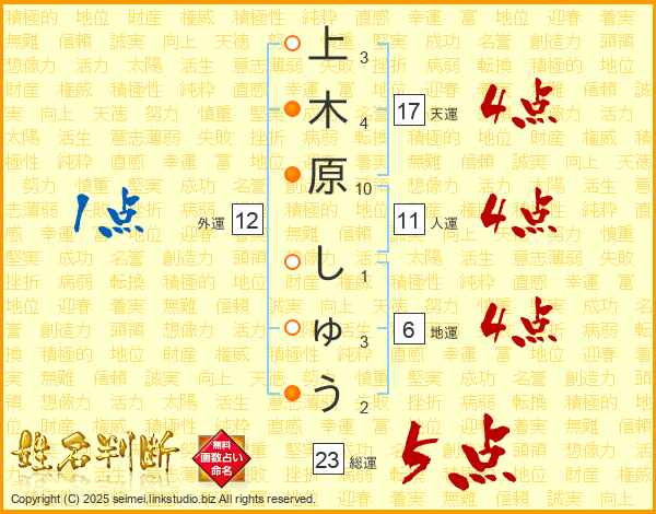 上(3画)木(4画)原(10画) し(1画)ゅ(3画)う(2画)