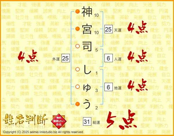 神(10画)宮(10画)司(5画) し(1画)ゅ(3画)う(2画)