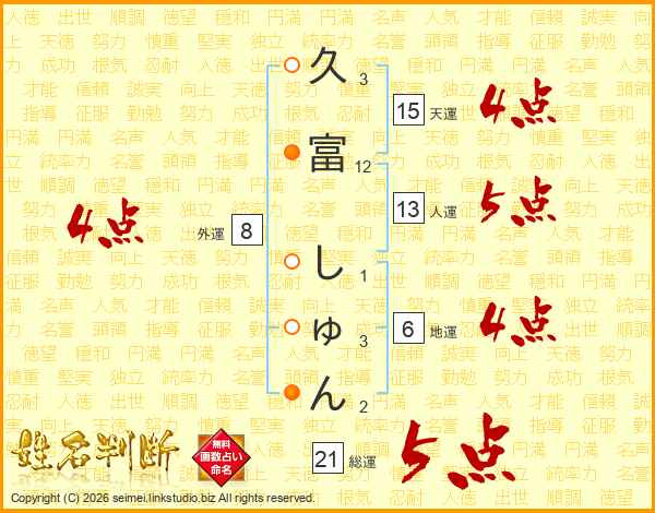 久(3画)富(12画) し(1画)ゅ(3画)ん(2画)