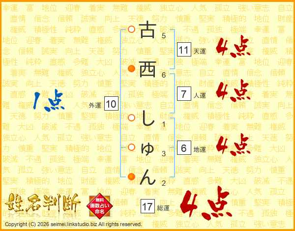 古(5画)西(6画) し(1画)ゅ(3画)ん(2画)