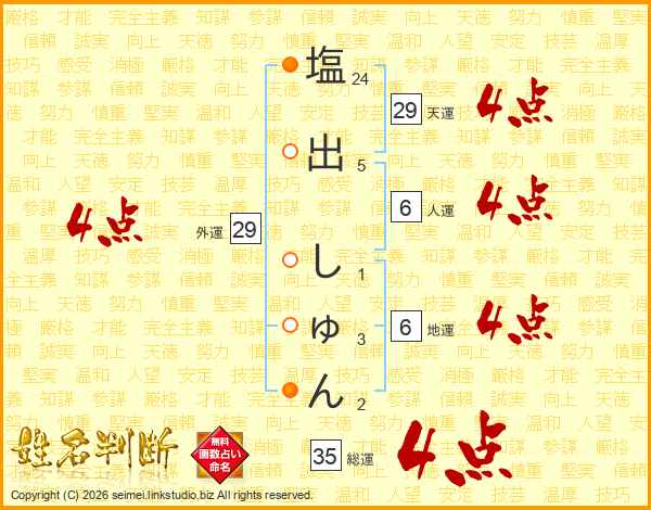 塩(24画)出(5画) し(1画)ゅ(3画)ん(2画)