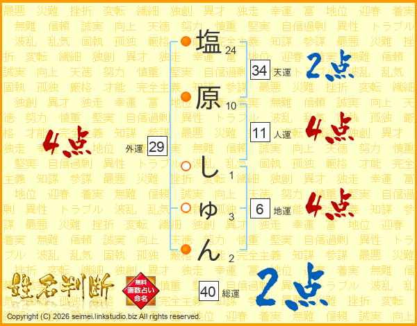塩(24画)原(10画) し(1画)ゅ(3画)ん(2画)