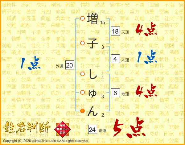 増(15画)子(3画) し(1画)ゅ(3画)ん(2画)